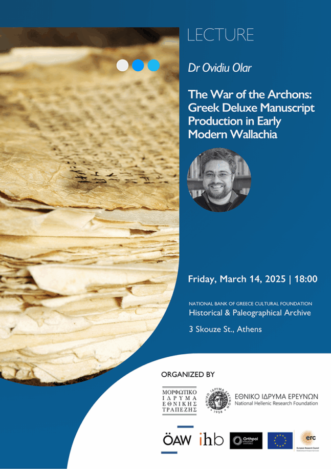 The Historical and Palaeographical Archives of National Bank Cultural Foundation , the Section of Neohellenic Research of the Institute of Historical Research (IHR / National Hellenic Research Foundation), and the Institute for Habsburg and Balkan Studies of the Austrian Academy of Sciences co-organize the lecture “The War of the Archons: Greek Deluxe Manuscript Production in Early Modern Wallach”.