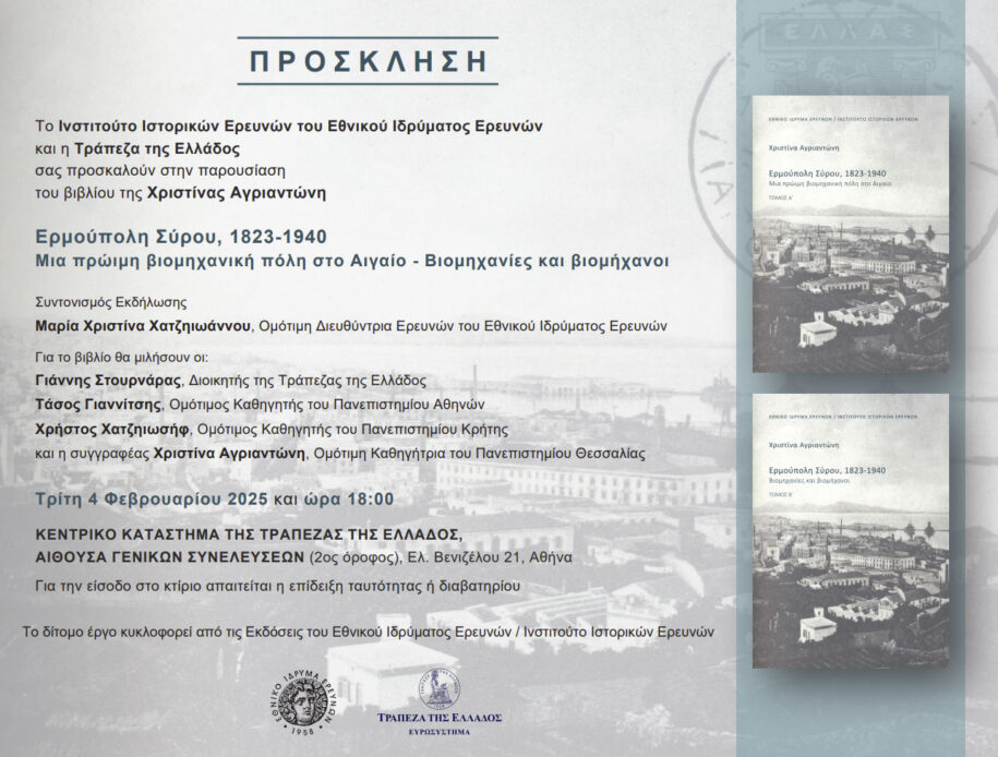 Το Ινστιτούτο Ιστορικών Ερευνών του Εθνικού Ιδρύματος Ερευνών και η Τράπεζα της Ελλάδος σας προσκαλούν στην παρουσίαση του δίτομου έργου που κυκλοφορεί από τις Εκδόσεις του Εθνικού Ιδρύματος Ερευνών / Ινστιτούτο Ιστορικών Ερευνών.