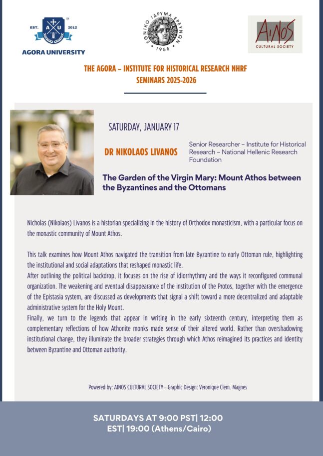 This talk examines how Mount Athos navigated the transition from late Byzantine to early Ottoman rule, highlighting the institutional and social adaptations that reshaped monastic life. After outlining the political backdrop, it focuses on the rise of idiorrhythmy and the ways it reconfigured communal organization.