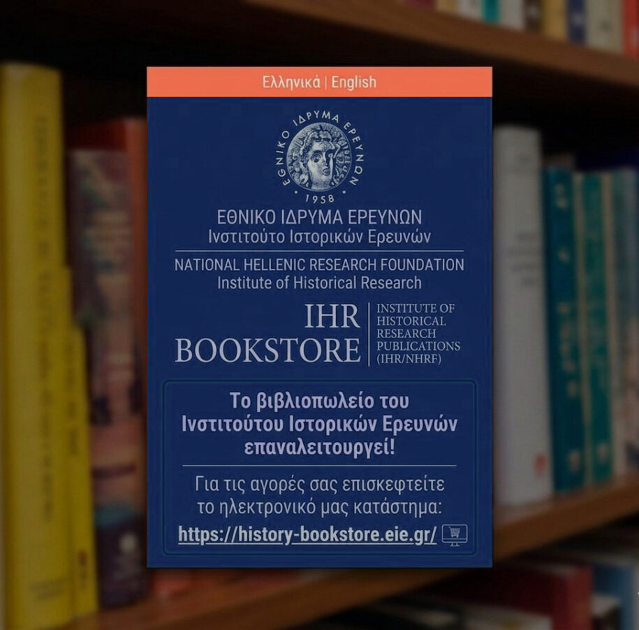 Το ηλεκτρονικό βιβλιοπωλείο του Ινστιτούτου Ιστορικών Ερευνών είναι και πάλι διαθέσιμο. Μετά από μια περίοδο αναστολής λειτουργίας λόγω των εργασιών αναβάθμισης του κτιρίου του ΕΙΕ, η πλατφόρμα τώρα επαναλειτουργεί και είναι έτοιμη να εξυπηρετήσει το αναγνωστικό κοινό.