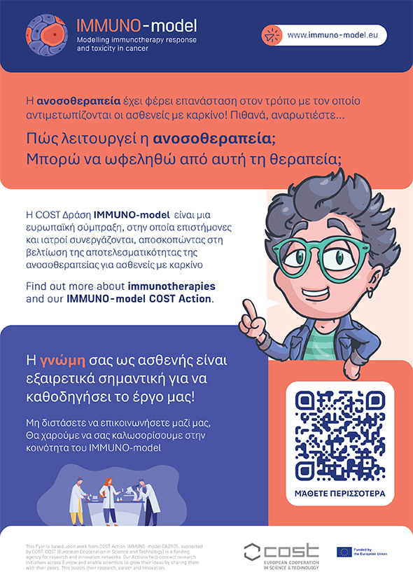 Το ΕΙΕ συμμετέχει ενεργά στο ευρωπαϊκό δίκτυο IMMUNO-model (COST Action CA21135), το οποίο επικεντρώνεται στην ανάπτυξη και βελτίωση προκλινικών μοντέλων για τη μελέτη της απόκρισης και της τοξικότητας της ανοσοθεραπείας στον καρκίνο. Στο εν λόγω δίκτυο, συμμετέχει το Εργαστήριο Ανάδειξης Βιοδεικτών & Μεταφραστικής Έρευνας του ΙΧΒ/ΕΙΕ, υπό την επιστημονική ευθύνη της Δρ. Θεοδώρας Κατσίλα.