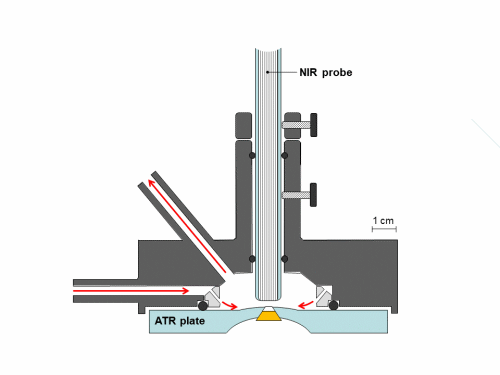 Attenuated total reflectance (ATR) spectroscopy in the mid-infrared, as well as diffuse reflectance via optical fibers in the near-infrared (NIR) are the least invasive vibrational spectroscopic techniques for the study of clay minerals.  Combining these two spectroscopic techniques in real-time and on the same sample is an extremely powerful method for the structural study of processes involving clays.  Due to the different extinction coefficients of the fundamental and higher order vibrations, the two techniques operate ideally on different sample scales.  Bukas et al. 2013 developed a simple environmental cell allowing for the independent synchronous collection of the NIR and ATR spectra under optimum sampling conditions and demonstrated its potential with the study of sepiolite upon drying from the H- and D-form.  Additional designs for non-invasive infrared sampling are reviewed by Chryssikos, 2017.
