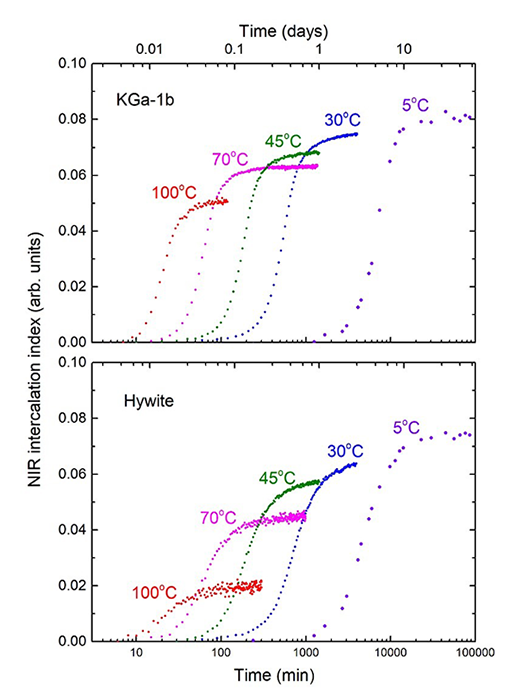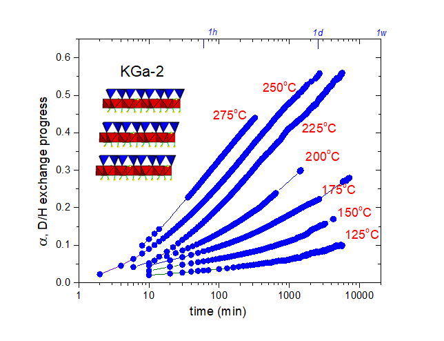 The aluminol groups in the interlayer of kaolinite resist D/H exchange at near ambient conditions, thereby suggesting that the stable H-isotope composition of this clay mineral may have been be preserved over geological times. A new experimental setup based on NIR spectroscopy via a diffuse-reflectance powder probe enabled the monitoring of D/H exchange kinetics in kaolinite exposed to a flow of D2O-saturated gas at temperatures/times in the range from 125οC/ 5 days to 275οC/ 3 hours. At any temperature, the degree of exchange was found to depend strongly on the stacking disorder of kaolinite (KGa-2 > KGa-1b) and was below detection limit in the most ordered hydrothermal sample (Keokuk). The results were modelled by colleagues at the Institute of Geological Sciences of the Polish Academy of Sciences in Krakow who demonstrated that the preservation of the pristine H-isotope composition is unlikely in kaolinites of low structural order, such as those of soil/weathering origin. The full story can be found in Derkowski et al. (2024).