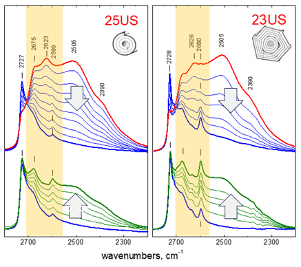 Smectites are expandable phyllosilicates owing to the negative charge of their layers which is compensated by hydrated cations in the interlayer.  The layer charge, a key determinant of the technological properties of smectite, is extremely difficult to measure by the standard structural formula and alkylammonium exchange methods.  In collaboration with the Institute of Geological Sciences of the Polish Academy of Sciences in Cracow, we have developed and calibrated a new infrared-based methodology for the determination of layer charge. The so-called O-D method exploits the spectroscopic properties of interlayer H2O which presents “dangling” O-H bonds protruding towards and weakly interacting with the charged siloxane layer. The interlayer is H2O is exchanged by D2O in situ (to avoid spectral interference with the structural OH of the mineral) and the exact wavenumber of “dangling” O-D bonds is linearly correlated to layer charge.  The new method is based on an intensive property measurement of an intrinsic interlayer and requires less than 5 mg of sample with essentially no preparation.  It is fast, accurate, precise and requires a modest single-reflection ATR cell with an environmental cup for performing   layer charge measurements on a routine basis. Its use and merits can be appreciated in several recent publications (e.g. Tsiantos et al. 2018Christidis et al. 2018Kuligiewicz et al. 2018, Kaufhold et al. 2019 etc.).  A critical assessment of the various methods for measuring the layer charge of smectites can be found here.