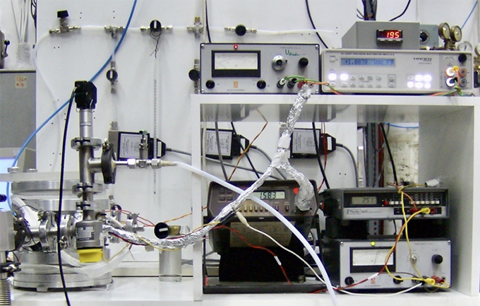 Testing platform for electro-chemical metal oxide thin film toxic gas sensors. The setup performs measurements for the optimization of the electrochemical response of thin film micro-sensors in a controlled environment of several toxic gases. This setup complements the already existing thin film preparation equipment for industrial applications and includes: vacuum equipment, 2 flow meters for controlled gas inlet, high vacuum chamber, sample heating surface (up to 400°C) supplied with constant current / temperature controlled with 2 thermo-elements, sensitive ohmmeter for real-time monitoring of the film resistance.