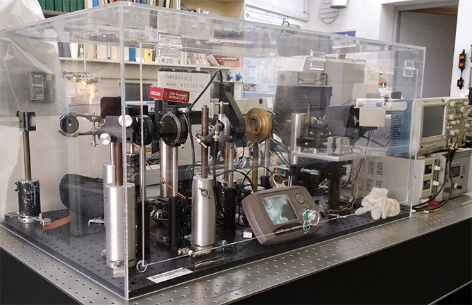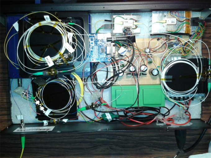 Home-built system includes a laser source (CW diode laser, 1550 nm), fiber optics, acquisition system, and home-built software for data analysis.