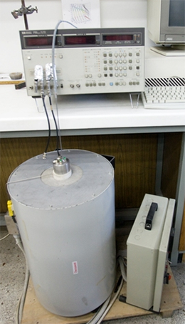 Dielectric Impedance Analyzer setup, by Hewlett-Packard 4192A, with homemade tube furnace and cell for dielectric measurements.