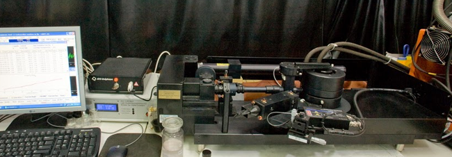 The setup performs microscale rheological characterization of macromolecule and colloid solutions, by monitoring the motion of suitably selected colloid nanoparticle tracers. Through tracer motion monitoring, conclusions can be drawn related to the structure, dynamics, interparticle/intermolecular interactions, as well as phase transitions in such systems. Temperature can be controlled by a Linkam TMS 94 hot stage and a Warner Instruments TC-124A objective warmer.