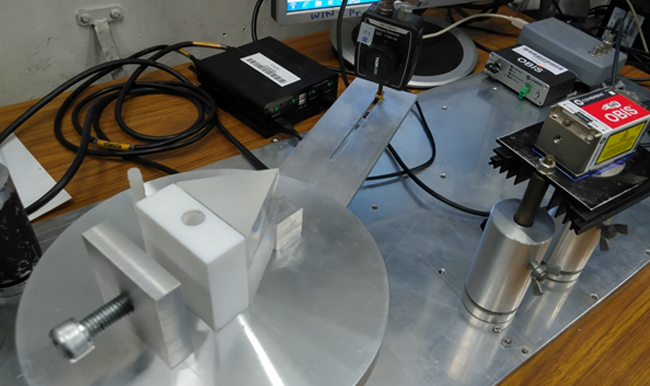 The device includes a goniometer with a prism stage, an Obis 640 nm laser and two DET100A2 Thorlabs detectors. There is available software for data acquisition and optimization. The system can be used for the characterization of thin polymer and biopolymer films (adsorbed amount, thickness and adsorption kinetics) on the metal (normally gold)/liquid interface.
