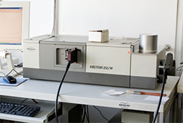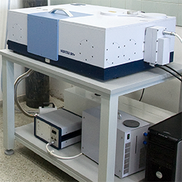 Near-infrared FTIR spectrometer, by Bruker, Vector 22N, equipped with a diffuse reflectance optical fiber bundle for powder samples, various path-length transmission fibers for liquids and an integrating sphere unit with a rotating cup sample holder. Working range 4000-12000 cm-1.