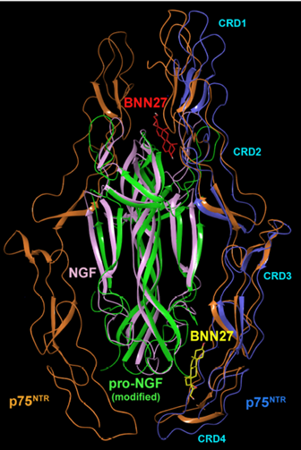 Binding sites of the neurosteroid BNN27 (in green and yellow) are predicted at TrkA:NGF 2:2 complex interface. The bound ligand reinforces the crucial protein-protein interactions.