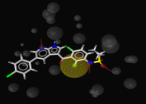 Optimized pharmacophore model for BRAFV600E inhibitors, comprising one hydrophobic feature (yellow sphere), three hydrogen bond acceptor features (red arrows) and a number of exclusion volumes (grey spheres). Vemurafenib is fitted to the model