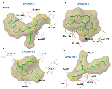 The derived hits stabilize crucial interactions at the hDNMT1 and hDNMT3A catalytic site.Binding poses of representative selected natural compounds docked at hDNMT1 (A & B) and at hDNMT3A (C & D)