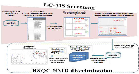 • Kokkotou, K.; Ioannou, E.; Nomikou, M.; Pitterl, F.; Vonaparti, A.; Siapi, E.; ZervouM.*; Roussis, V.*  An integrated approach using UHPLC–PDA–HRMS and 2D HSQC NMR for the metabolic profiling of the red alga Laurencia: Dereplication and tracing of natural products. Phytochemistry (2014) 108, 208–219