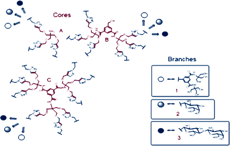 In our laboratory, to design and synthesize biocompatible nanoscale dendritic macromolecules, we are using a combination of convergent and divergent methods of dendrimer synthesis based on microwave-assisted Huisgen key alkyne azide cycloaddition. This modular strategy is based on the versatile geometry of TRIS (monomer AB3) for a rapid dendritic growth of terminal branches containing glycerol- or disaccharide groups and the synthesis of cores of variable shape and symmetry to allow: