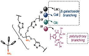Based on promising physicochemical and crystallographic results obtained from in vitro studies with lectin [1,2], various glycerol- and glycodendrons, containing the schematically described focal amino group, are used as versatile precursors for the construction of small libraries of molecules used in various areas of interest as: