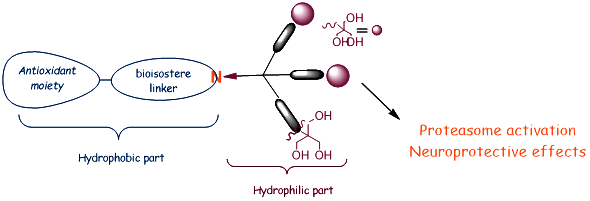 The effect on proteasome activity and function of nanosized amphiphilic molecules synthesized by hybridization of an anti-oxidant moiety with an amino block grafted with carbohydrate or glycerol groups, was studied after improvement of the synthetic route leading to these analogues. Based on biological assays, one of the dendritic compound appears to be involved in the activation of the proteasome indicating that the use of such hybrid molecules may be interesting in anti-aging strategy.