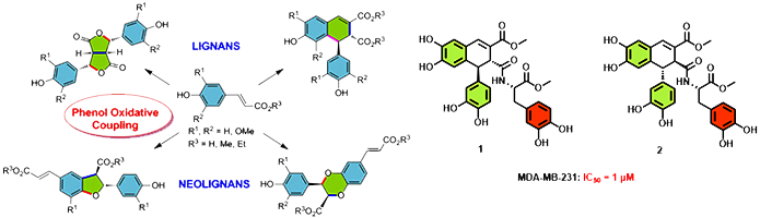 Lignans comprise a large family of optically active compounds isolated from plant extracts sharing a common feature, that is, two phenylpropanoid units coupled through the central carbons of their propane side chains. In plants, the biosynthesis of lignans is probably realized through a peroxidase enzyme-catalyzed free radical dimerization of hydroxy caffeic acid (HCA) derivatives or of their reduced analogs. These polyphenolic compounds exhibit a wide range of biological activities including antiapoptotic and cytotoxic actions among others. Capitalizing on our previous findings that compounds 1 and 2 showed interesting antiproliferative activity against MDA-MB-231 cell line, the group focuses on the synthesis of new hybrid compounds of the lignan-type with improved biological activity and pharmacokinetic properties.