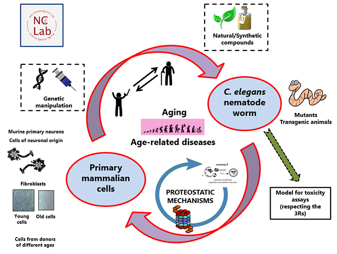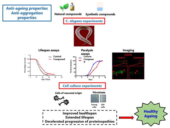We are working with a very powerful model organism, the nematode worm Caenorhabditis elegans. This is a great model for the identification of compounds with anti-ageing properties in a significantly short period. Moreover, there are several nematode strains serving as models for various proteinopathies, including Alzheimer’s disease. Using this model organism and the relative strains, we perform screening to identify compounds with anti-ageing and anti-aggregation properties that may ultimately be used in preventive or therapeutic strategies against ageing and/or Alzheimer’s disease. Our results are usually verified in existing cellular models of ageing (replicative senescence model) or of the respective disease.