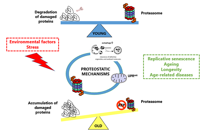 Previous work has revealed that the proteasome expression and function are down-regulated during replicative senescence and human ageing while partial proteasome inhibition results in irreversible premature senescence. We seek to reveal how the expression but also the function of the proteasome is regulated under normal but also stress conditions and upon the progression of replicative senescence, stress-induced premature senescence, ageing and age-related diseases. We investigate the positive or negative effects of various environmental factors (including bioactive compounds found in our normal diet, various kind of stresses etc) on the expression and function of the proteasome. Finally, the proteasome is one of the main actors in the maintenance of protein homeostasis (proteostasis). We aim to reveal how the proteasome cross-talks with other mechanisms of proteostasis (such as autophagy) but also with mechanisms of cellular surveillance that sense and respond to protein damage such as the heat shock response (HSR) or the Unfolded Protein Response in mitochondria (UPRmit).