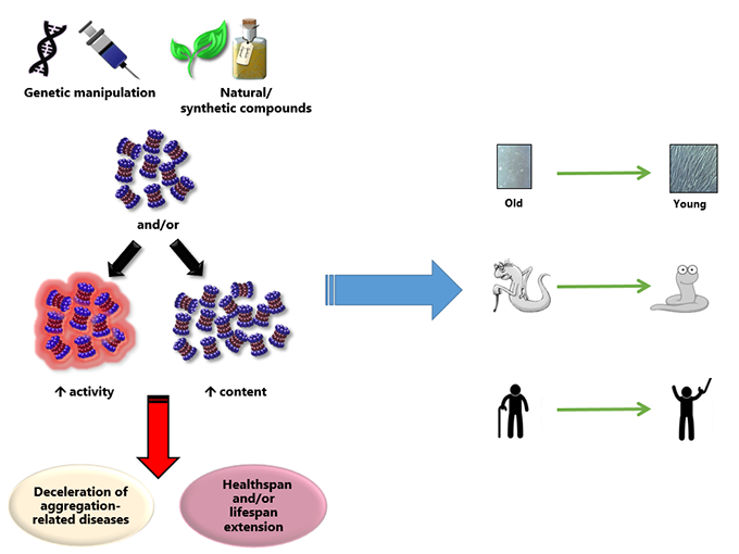 Previous work has shown that proteasome activation is feasible in the cellular level or in the organismal level (C. elegans) either through genetic means or through compounds. Compound-mediated proteasome activation occurs through stereochemical interaction with the proteolytic proteasome core, through post-translational modifications of the proteasome subunits or regulators or through the activation of transcription factors that regulate the expression of the proteasome subunits under specific conditions such as the Nuclear factor (erythroid-derived 2)-like 2) (Nrf2). Proteasome activation results in cellular and organismal lifespan extension and healthspan amelioration.