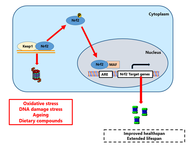 The Nuclear factor (erythroid-derived 2)-like 2) (Nrf2) transcription factor is the major factor orchestrating the antioxidant cellular response. Various proteasome subunits are included among its target genes. Previous work has identified 18α-glycyrrhetinic acid as a natural proteasome activator that works through the activation of Nrf2, leading to cellular (human primary fibroblasts) and lifespan (C. elegans) extension. We therefore investigate the role of Nrf2 in the progression of ageing and in stress response, mainly (but not exclusively) focusing on its role on proteasome regulation.