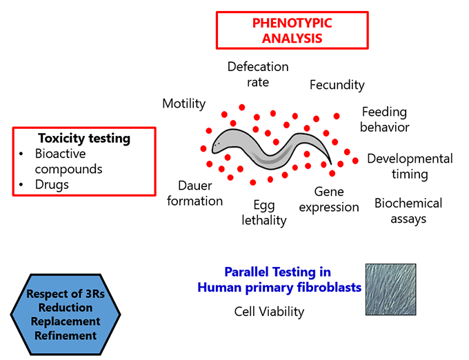 The nematode worm Caenorhabditis elegans is an emerging model in biomedical and environmental toxicology. It is well-validated for toxicological research and recommended by NIH for whole-animal toxicology and safety testing. This is mainly based on the following advantages of the organism: (1) the chemical effects on C. elegans predict toxic effects in mammals, (2) testing on C. elegans reduces the use of mammals in toxicology assays, (3) the extended knowledge on C. elegans physiology, coupled with powerful gene manipulation technologies, provide powerful insights into toxic effects on the level of a whole organism and uncover the complex interactions between the genes and the environment. A standardized soil toxicological testing method using C. elegans has already been adopted by the American Society for Testing and Materials (ASTM, 2002) and later by the International Standards Organization in Europe (ISO 2007). Moreover, C. elegans is well suited for neurotoxicological studies. Phenotypic characteristics such as feeding behavior, developmental timing, fecundity and motility have been shown to be affected upon exposures to heavy metals, pesticides, genotoxic agents as well as due to proteotoxicity during the progression of proteinopathies. Consequently, its use permits the toxicity assessment of compounds. We have optimized all the necessary protocols in the lab and may provide a fast toxicity testing of drugs or novel bioactive compounds using this multicellular organism. We also perform further testing in human primary fibroblasts.