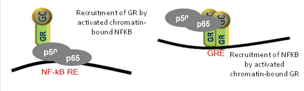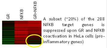 Glucocorticoids (GCs) are essential steroid hormones widely used as potent anti-inflammatory drugs; however, their clinical use is often accompanied by adverse side effects. The anti-inflammatory action of GCs is exerted through the glucocorticoid receptor (GR) in part by antagonizing the pro-inflammatory nuclear factor kB (NF-kB) whereas the majority of side effects are assumed to be mediated by transactivation of GR target genes. We previously reported the first genome-wide map of GR and NF-kB crosstalk and substantially contributed to the understanding of the networks underlying the glucocorticoid and inflammatory signaling pathways (1).