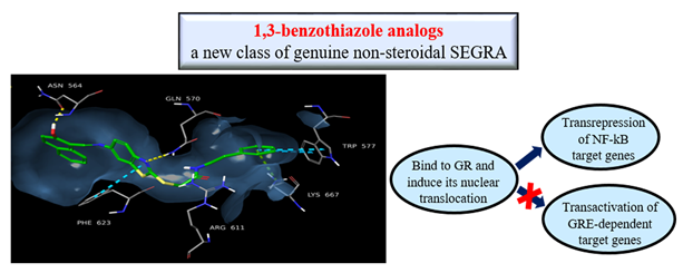 Development of selective GR agonists (SEGRA) that will preferentially favor transrepression of pro-inflammatory NF-kB target genes over transactivation of genes associated with undesirable effects is expected to improve the therapeutic potential of GCs. We recently identified two 1,3-benzothiazole analogues as genuine SEGRA using a multidisciplinary approach in collaboration with the Molecular Analysis, Organic and Organometallic Chemistry and Medicinal Chemistry groups of ICB (2).