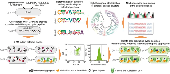 It has been widely recognized that many incurable diseases with an enormous socioeconomic impact, such as Alzheimer’s disease, Parkinson’s disease, amyotrophic lateral sclerosis, type 2 diabetes etc., are initiated by a common molecular mechanism: the misfolding of specific proteins. With the ultimate goal of identifying compounds with potentially therapeutic effects against these disorders, we have developed a highly versatile synthetic biology platform for discovering macrocyclic rescuers of disease-associated protein misfolding. In this system, large combinatorial libraries of cyclic oligopeptides (>200 million members) are biosynthesized in Escherichia coli cells and simultaneously screened for their ability to rescue disease-associated protein misfolding using an ultrahigh-throughput genetic screen. Hit compounds identified by this screen, are subjected to more detailed evaluation by biochemical and biophysical methods of protein analysis, and their ability to inhibit protein misfolding-induced pathogenicity is evaluated using appropriate mammalian cell assays and in vivo models of the disease of interest. Medicinal chemistry approaches are subsequently employed to optimize the biological properties of the bioactive macrocycles in order to generate therapeutic leads against the target diseases.