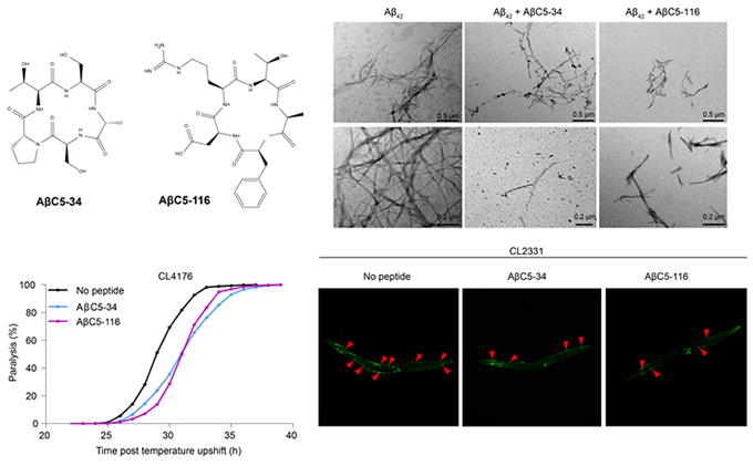 - We have identified hundreds of head-to-tail cyclic oligopeptide sequences that inhibit the misfolding and aggregation of Αβ. For four of them, termed ΑβC5-34, ΑβC5-116, ΑβC7-1 and ΑβC7-14 we have shown that they interfere with the normal course of Aβ aggregation and the formation of typical Aβ fibrils, generating species with reduced binding to the neuronal surface and reduced cytotoxicity in vitro and in vivo (Matis, I. et al., Nature Biomedical Engineering, 2017; Delivoria, D.C. et al., Sciences Advances, 2019).