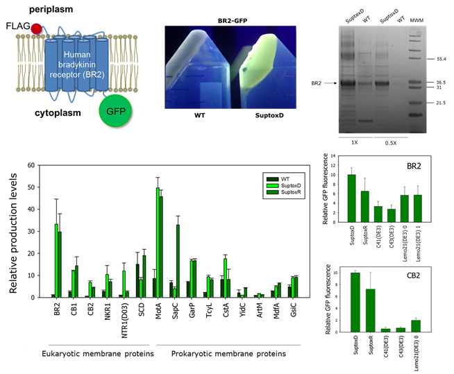 - E. coli SuptoxD and SuptoxR can produce hard-to-express recombinant membrane proteins of sufficicent quality and quantitity for biochemical and structural studies (Michou et al., ACS Synthetic Biology, 2019; Michou et al., Bioprotocol, 2020)