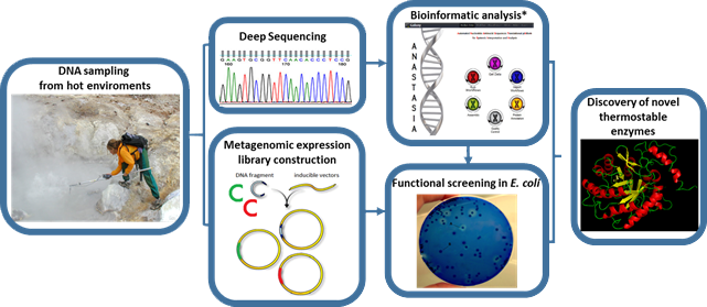 Enzymes are biocatalysts used in a wide range of “white biotechnology” applications. Hydrolases, a specific class of enzymes, have received great attention due to their high selectivity, potential synthetic ability and broad range of applicability, especially in the production of fine chemicals and pharmaceuticals. Despite their advantages, a very limited number of hydrolases are currently being used in the industry. This is due to the fact that many industrially relevant processes require high temperatures where conventional biocatalysts perform poorly. For such processes, thermo- or hyperthermostable enzymes are required. Thermophilic organisms are a potential rich source of such enzymes, which, however, remains largely unexplored. To address this, we apply systematic genomic and metagenomic screening approaches to identify novel hydrolases from microorganisms residing in extreme environments around the globe.