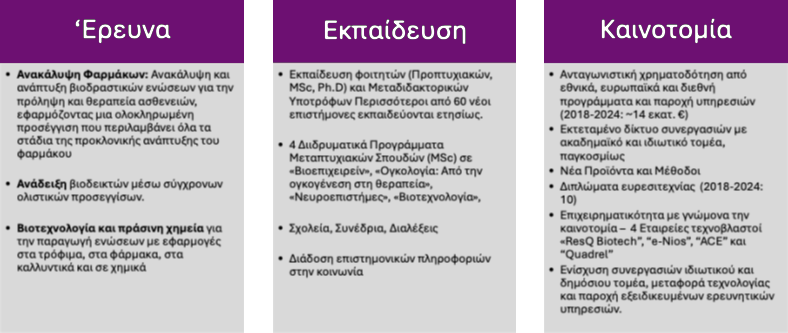 To IXB είναι μοναδικό στην Ελλάδα στην φαρμακευτική έρευνα χρησιμοποιώντας μια ολοκληρωμένη προσέγγιση που περιλαμβάνει όλα τα στάδια της ανακάλυψης φαρμάκων (δομική βιολογία, σχεδιασμός, σύνθεση, βιολογική αποτίμηση in vitro, ex vivo και in vivo, ανάπτυξη νανοφορέων για την αποτελεσματική χορήγηση τους) σε συνδυασμό με μεταφραστική έρευνα (συνεργασία με κλινικούς, βιοδείκτες, ανάλυση μεγάλων δεδομένων). Ανάλογες πειραματικές προσεγγίσεις πραγματοποιούνται σε φυσικές ουσίες αναφορικά με την δράση τους στην ευζωία, καθώς και σε ασθένειες που σχετίζονται με την γήρανση.