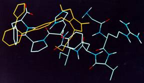 Molecular Basis of Hypertension. Superimposition of the bioactive conformation of AT1 antagonist Losartan (commercially available antihypertensive drug) with [Sar1 Tyr(OMe)4 ]AII, a peptide antagonist of the peptidormone AII which is implicated in the hypertension process. The models have derived with the combination of 2D HR-NMR spectroscopy and Molecular Modelling.