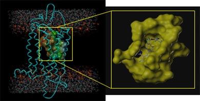 Docking of losartan in the transmembrane region of AT1 receptor. The lipid bilayer is influencing the topographical location of the ligand.